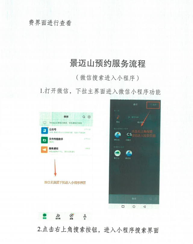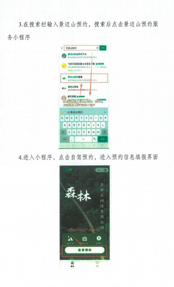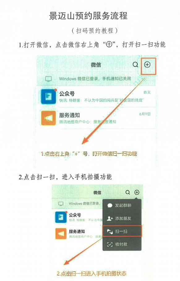 进入景迈山的游客也可通过微信搜索“景迈山预约服务”小程序进行预约;持护照、港澳台通行证等证件的境外游客、无法使用智能手机的老年人可持有效证件至现场服务点办理预约登记。游客统一入口为景迈大桥入口,抵达景迈大桥综合服务点时,需主动出示预约二维码经工作人员核验后入园。