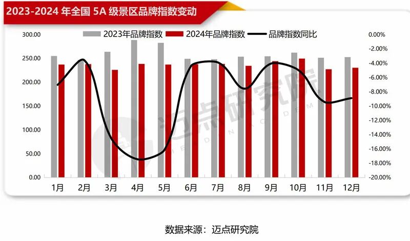 据迈点研究院数据监测,2024年国内5A级景区品牌指数全年表现欠佳、回归理性,整体弱于2023年。相对于2023年文旅消费需求的暴增、市场的高速反弹,2024年游客消费趋向理性,景区不再单纯追求“流量”和“网红”,而是更加侧重产品和服务创新、精细化运营,其品牌宣传推广工作从“冒进间断”趋向“平稳日常”。从2024年各月份的品牌指数表现看,淡旺季之间的差异缩小,恰好体现了全年“旺季更旺,淡季不淡”市场特征。