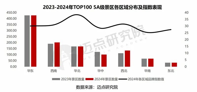 5A级景区百强榜单区域分析,数量方面依然是华东地区“遥遥领先”,共占据38个席位,与2023年持平。其次为西南地区18家,较去年增加1家;华北地区紧随其后,占15席;东北地区数量最少,共3家,与去年持平,较为稳定。值得一提的是,2024年,西北地区旅游热点现象频发——《我的阿勒泰》引爆新疆阿勒泰旅游热、甘肃天水“麻辣烫”火出圈、《正大综艺》和《旅行任意门》等节目带火宁夏中卫沙坡头景区等,带动5A级景区品牌提升,本年度该区域新上榜4席,共计12家。从2024年各区域品牌指数均值来看,华北地区领先优势显著,为各区域最高;其次是西北、西南和华东地区;再次为华中、东北,华南地区最低。