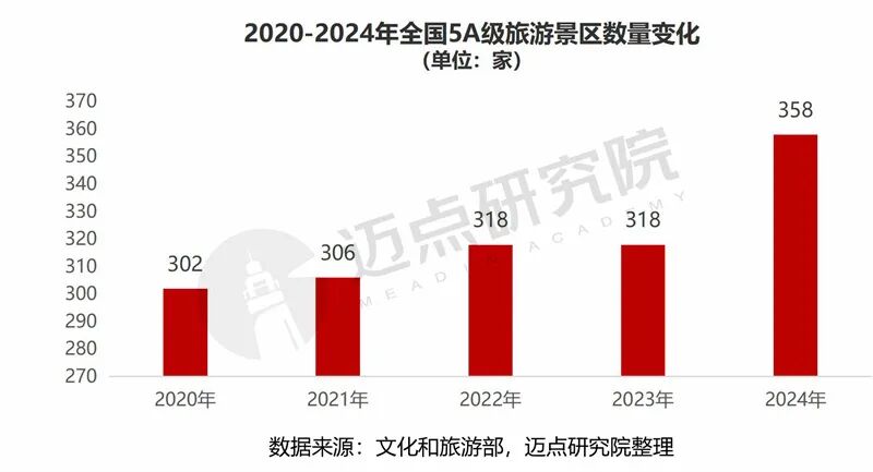 2024年新增5A级景区40家,精品优质旅游景区持续扩容,达到358家