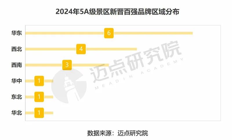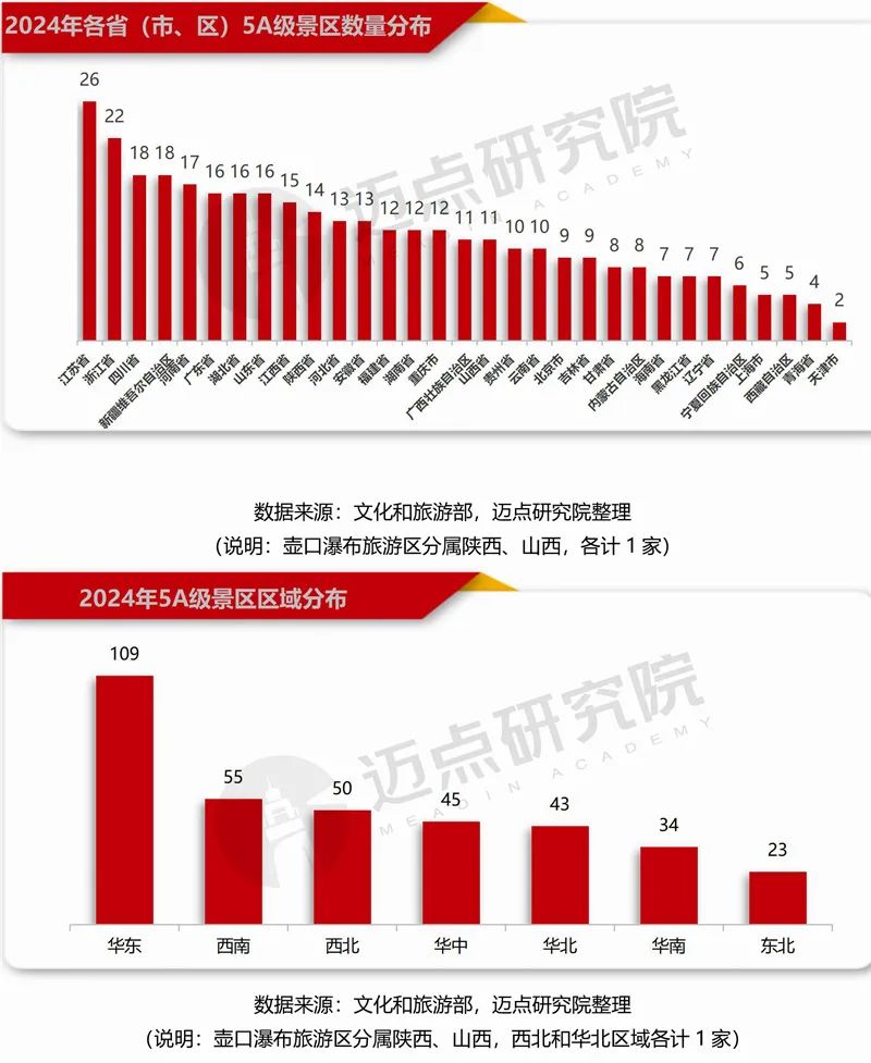 全国5A级景区的区域分布:华东地区的5A级景区最为密集,突破100家,达到109家;其次是西南和西北区域,分别为55家、50家;华中和华北均超40家、华南地区34家;东北地区23家,数量最少。
