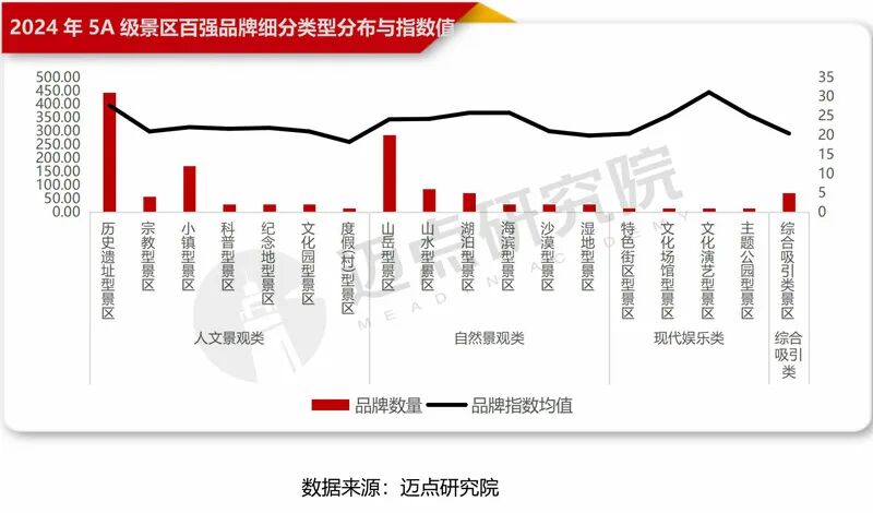5A级景区品牌类型分布,5A级景区百强榜单中,人文景观类54个、自然景观类37个,二者合计占比91%;细分类型中,以历史遗址型景区、山岳型景区、小镇型景区为主,分别占据31、20、12个席位。从品牌指数值分析,2024年5A级景区各类型中品牌指数由高到低分别为:现代娱乐类景区(363.03)、自然景观类景区(334.85)、人文景观类景区(312.76)、综合吸引类景区(291.39 );细分类型品牌指数前三由高到低分别为:文化演艺型景区(444.11)、历史遗址型景区(395.75)、海滨型景区(368.45)。2024年,“跟着演出去旅行”、“文博热”、“古建热”等将文化演艺型景区、历史遗址型景区品牌推向热潮,其知名度和美誉度显著提升。