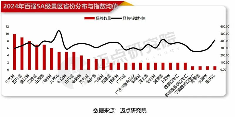5A级景区百强榜单省份分析,数量前五分别为:江苏省、四川省、浙江省、江西省和山西省并列、陕西省。与2023年相比,本年度江西省百强景区增加3席,其“增量”名列前茅。2024年“江西风景独好”品牌不断擦亮,策划开展“跟着诗词游江西”“跟着音乐游江西”“跟着非遗游江西”等系列主题活动,“江西文演”和“江西小炒”名片携手出圈,全省旅游、餐饮和文化娱乐相关消费潜能不断释放,全年旅游人次、收入均实现双位数增长。此外,受“西北深度游”的爆火影响,本年度宁夏回族自治区、青海省均有1家5A级景区上榜,相比2023年实现了“零的突破”,对应为其王牌景区——中卫市沙坡头景区、青海湖景区。从品牌指数均值来看,北京市(589.61 )、湖南省(578.39 )、重庆市(563.07 )排名前三,主要得益于故宫博物院与颐和园及八达岭-慕田峪长城、岳麓山·橘子洲景区、大足石刻景区等头部5A级景区品牌的加持。